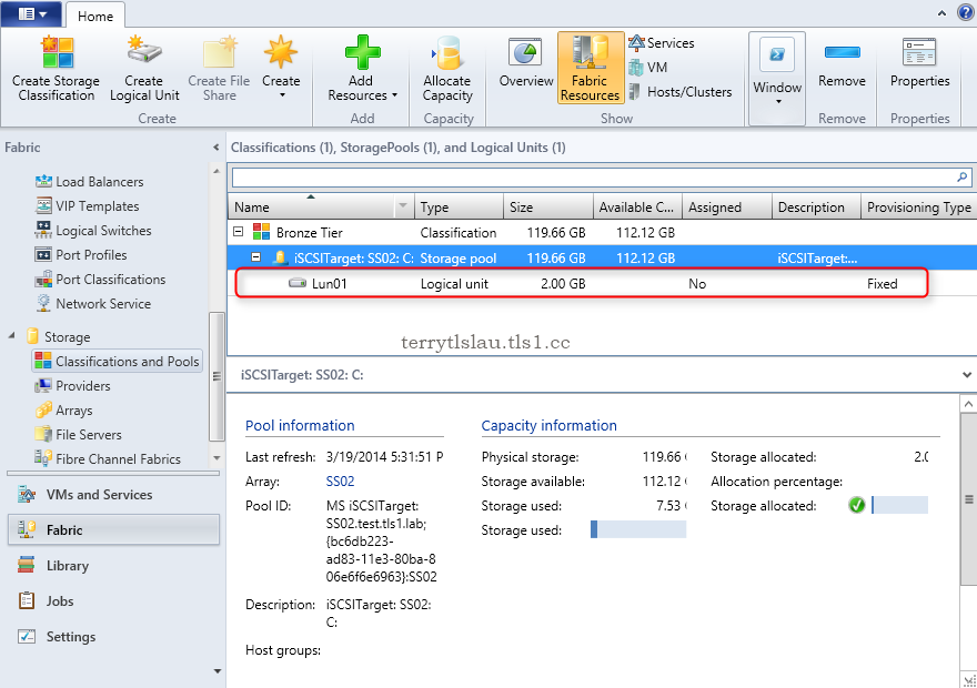 Remark: By default, the logical unit is created in "Fixed" provision type for Windows Server 2012 R2 iSCSI target by the wizard of System Center Virtual Machine Manager 2012 R2. To change the provision type, administrators can perform PowerShell script to create a logical unit.