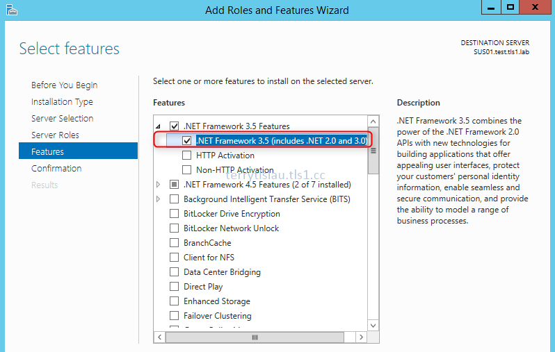 Remark: Make sure SUS01 connected to the network and access the Internet. If not, administrators have to provide the source for installing ".NET Framework 3.5 (Includes .NET 2.0 and 3.0)". For more information, please read "Installing Microsoft .NET Framework 3.5 in Windows Server 2012 or R2 by Windows Server installation disk".